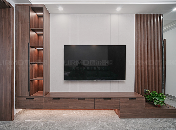 全屋通鋪瓷磚,視覺上看起來更顯大氣,電視柜抽屜柜搭配展示柜, 美觀又實用!