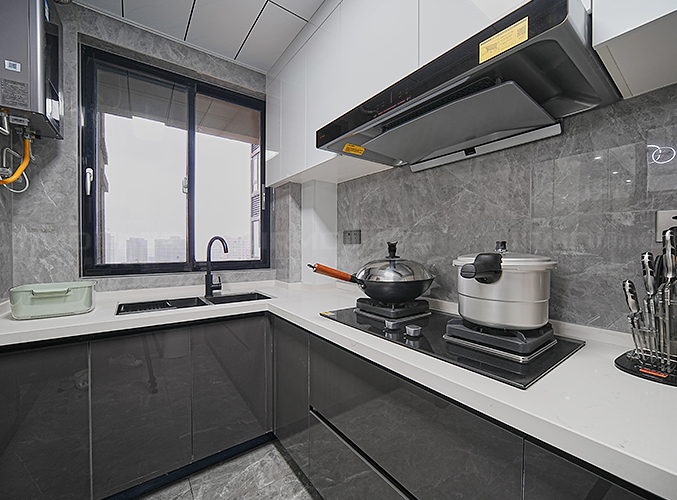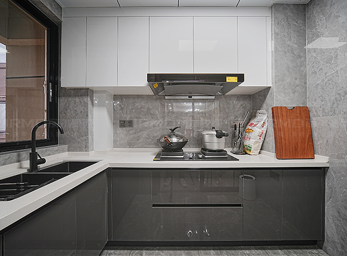 簡約大氣,上下方都有收納柜,視覺層次更加豐富,分擔了廚房收納還可以減少了儲物壓力。
