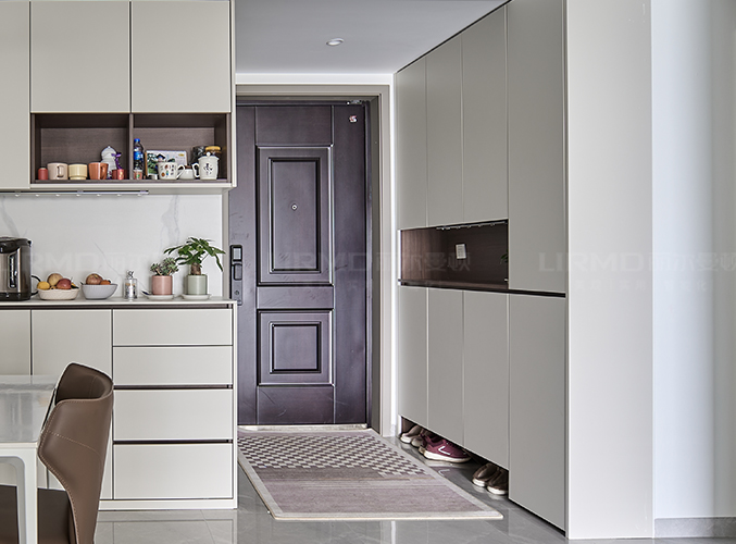 柜體采用巴斯特榆木搭配象牙灰柜門,整體簡約干凈,底部鏤空設計,方便放置鞋子。
