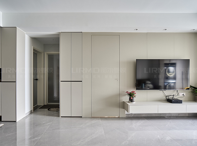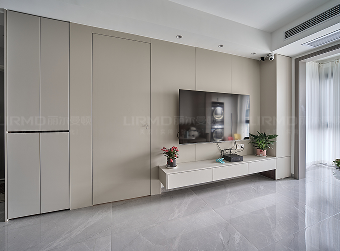 采用600乘1米2大地磚通鋪,上方做無主燈設計更顯極簡,電視背景前儲物柜,內嵌式設計,