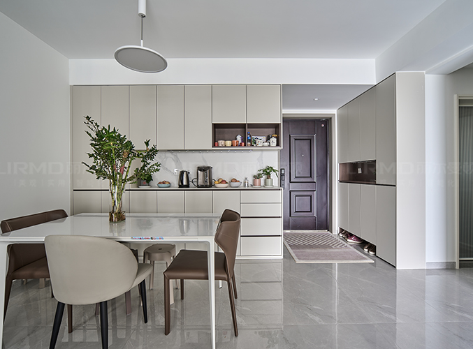 一整排的餐邊柜,中間部分可以做一個水吧臺的使用,背板和臺面均是巖板材質,更顯高級感。