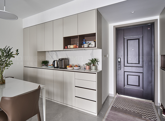 和墻面平齊,不占空間的同時收納更加方便,右邊通往小孩房的隱形門設計,