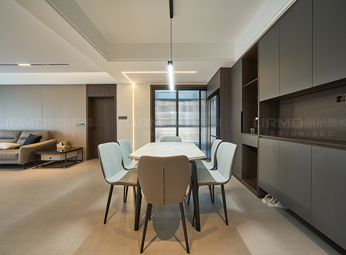 餐廳做同款餐邊柜,入戶收納+飲水機+冰箱實現多功能化,中間預留管線設計,下方懸空設計,