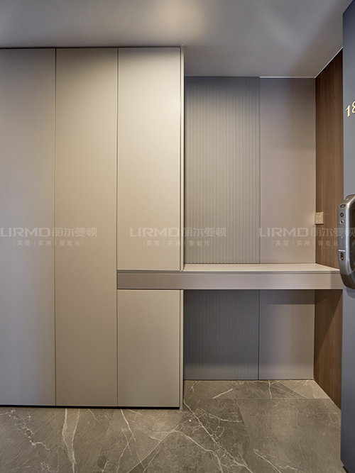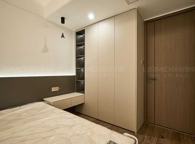 實木柜體搭配PET膚感柜門,一門到頂柜子設(shè)計+右側(cè)懸空桌臺設(shè)計,下方懸空設(shè)計,