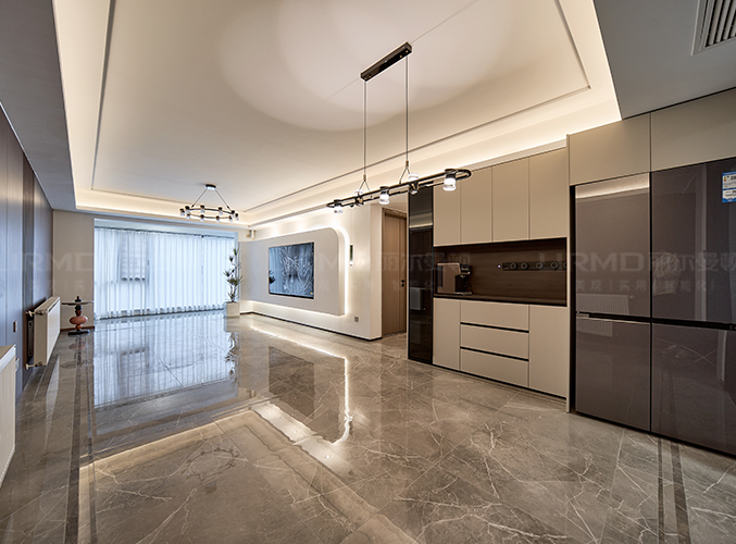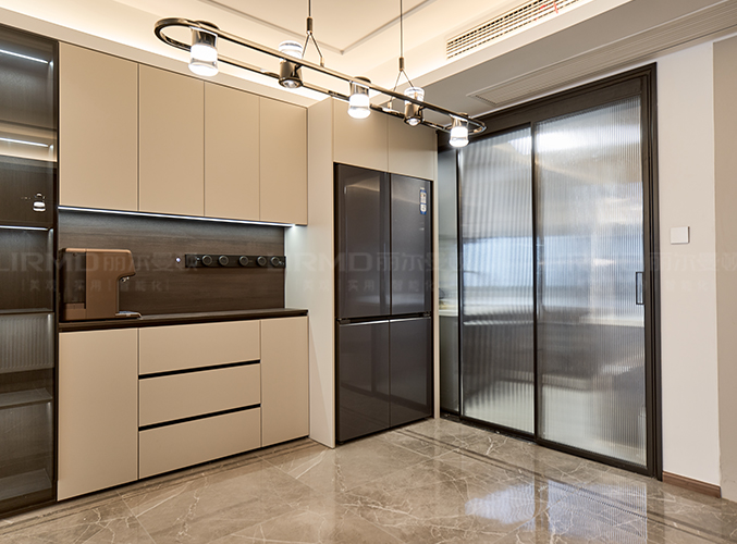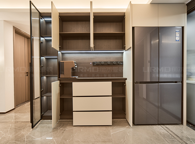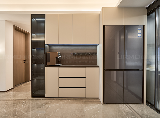 整體的墻柜很好的利用空間,收納大大的提升,內(nèi)嵌式冰箱設(shè)計,不占空間,