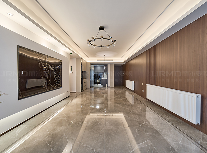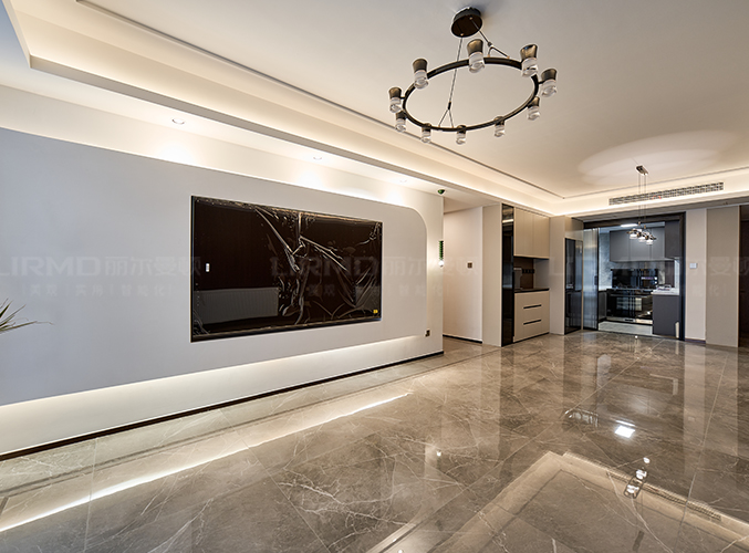 整墻做內(nèi)嵌電視背景墻,疊級吊頂+射燈營造輕奢氛圍,白色石膏板電視墻搭配木制背景墻簡潔大方。