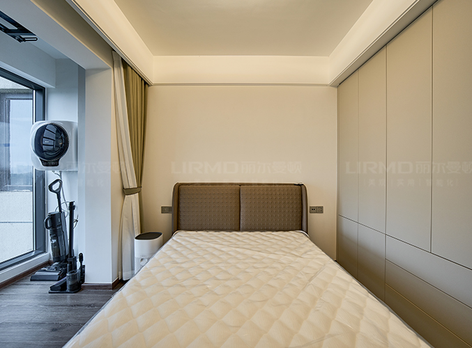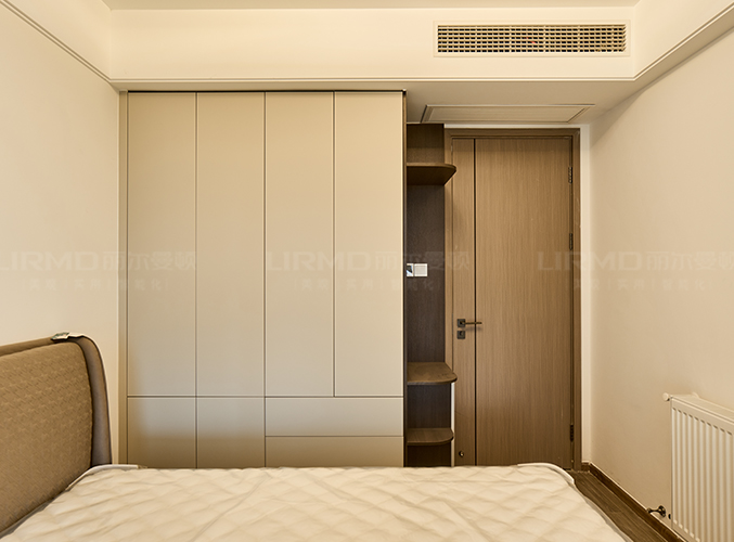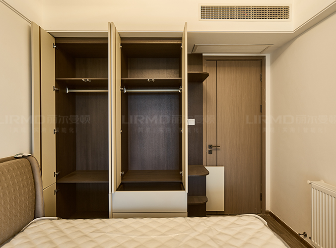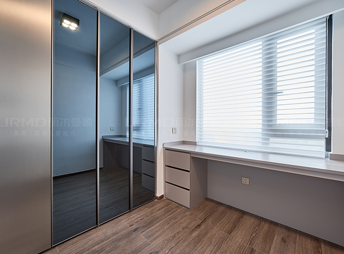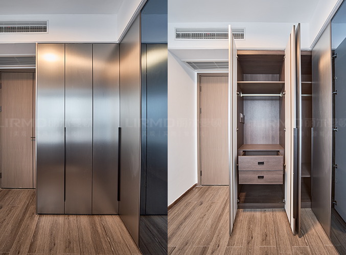 衣帽間做L型衣柜+一門到頂設(shè)計,三面柜門做落地穿衣鏡功能性十足。
