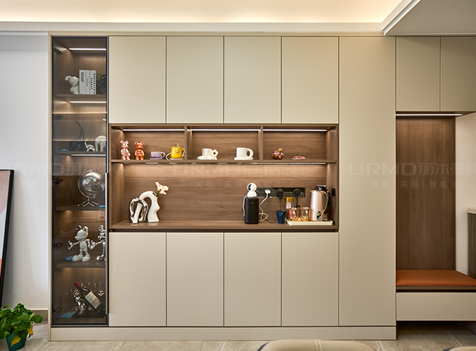 多功能餐邊柜留有換鞋區和掛衣區,進去更方便,中間位置做開放格,可放置更多物品,
