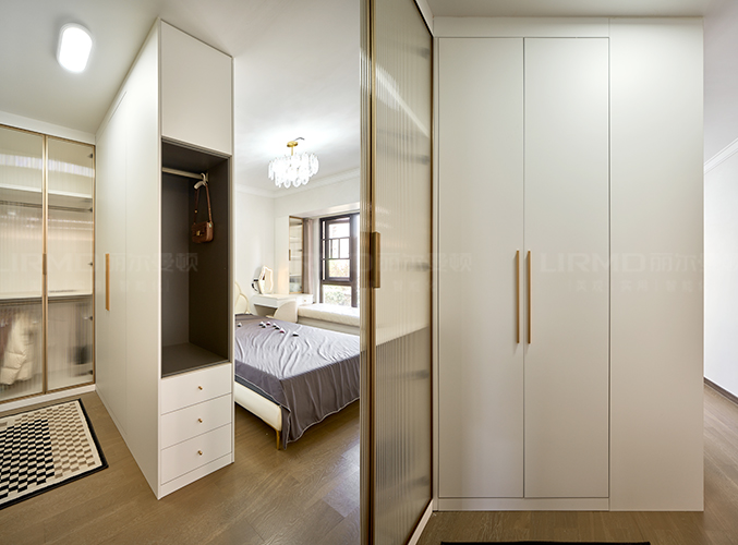 入式衣帽間,方便收納更多衣物、包包等,反面一門到頂衣柜,靠窗做懸空梳妝臺,