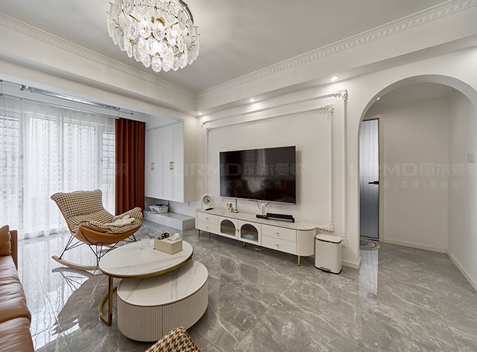 整屋通鋪瓷磚,盡顯大氣,整墻電視背景墻設計,下方搭配柜子,收納方便,吊燈設計,