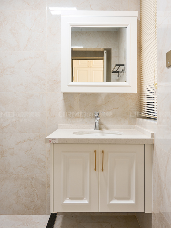 浴室柜+洗漱臺,柜體采用足18厚杉木芯板,柜門采用LSB板PET膚感柜門,