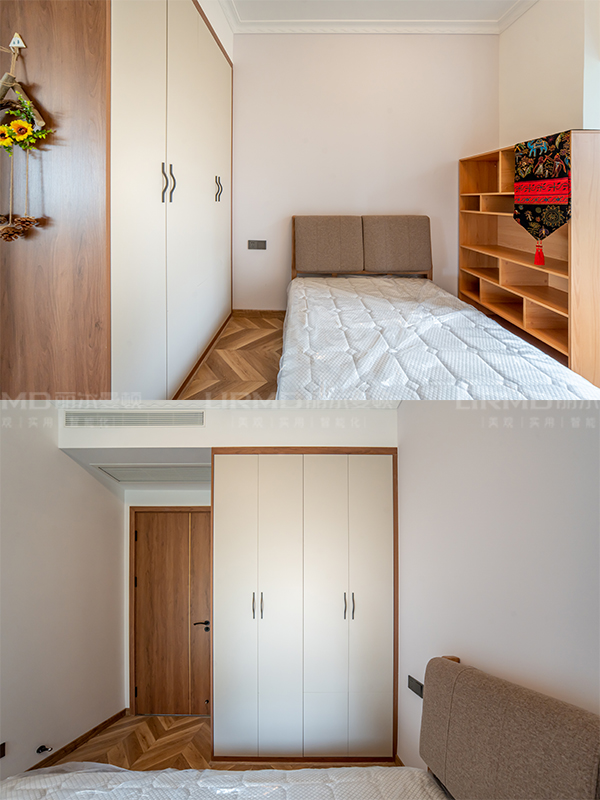 全屋定制:使用萬象天冠品牌18厚環(huán)保ENF級杉木芯板柜體、山東豐源仙檀山歐松板大薄片膚感柜門、