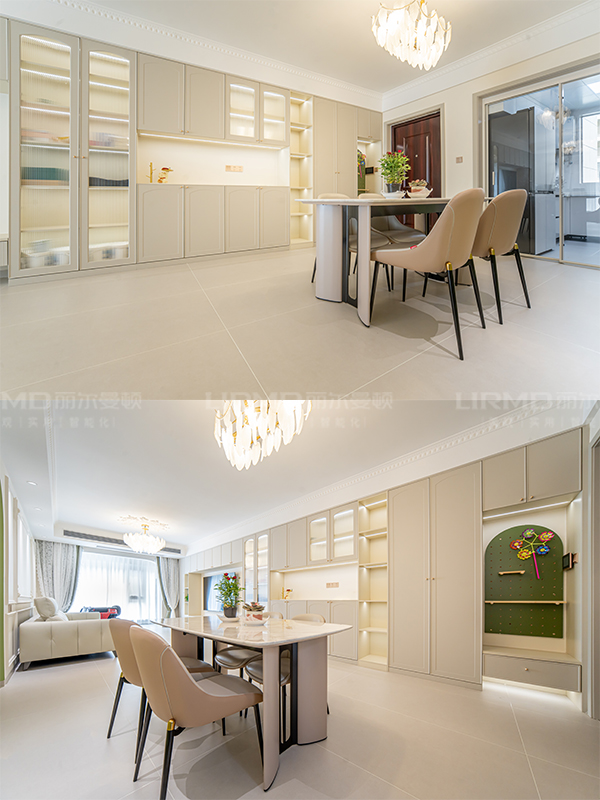 客餐廳墻面采用pu線條及角花作為點綴,搭配牛油果綠,更顯優雅復古