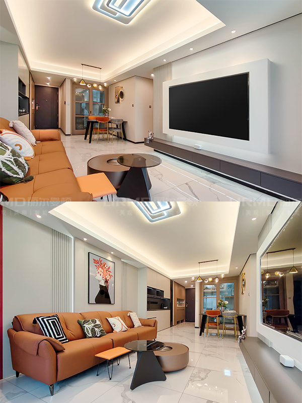 餐廳和客廳沙發背景墻都結合墻板+木格柵的撞色設計,時尚又高級!