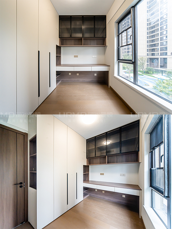 書房采用書桌衣柜一體化設計,搭配玻璃柜門,更有層次感
