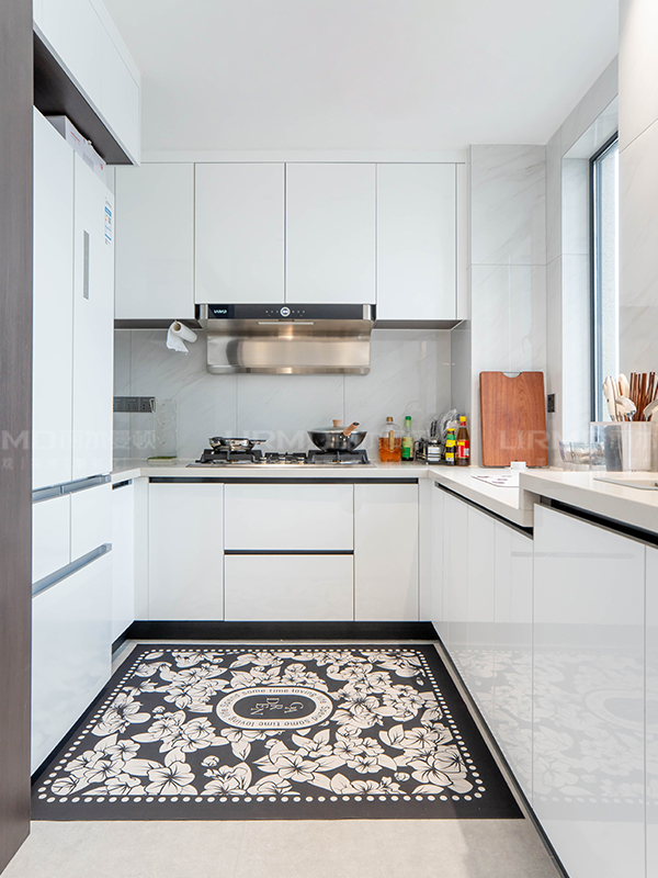 廚房陽臺一體式布置形成多功能空間,櫥柜連接西廚呈L型布置,廚餐廳區域一體化。