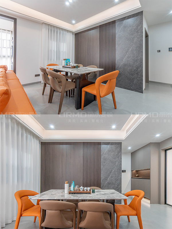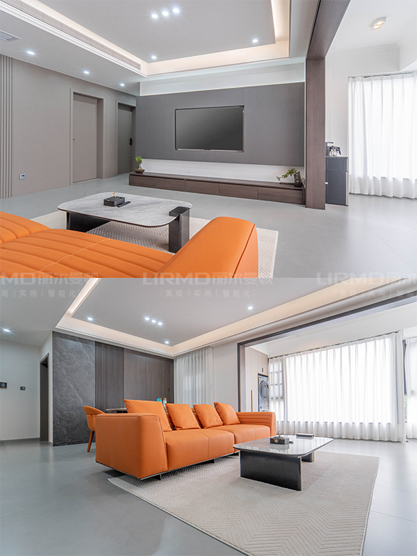 ?沙發(fā)背景墻與電視背景墻同顏色、同材質(zhì)、同款式一體式設(shè)計,增添空間立體感。