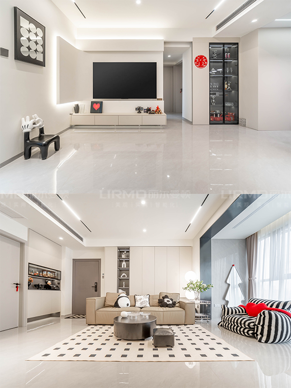 客廳做轉角的懸浮電視背景墻,搭配滿墻沙發背景收納柜,美觀整潔收納能力強