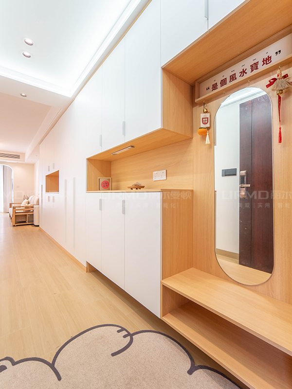 入戶衣帽間設(shè)計(jì)了換鞋凳、掛衣區(qū)、入戶鞋柜,并與餐邊柜做一體式設(shè)計(jì),簡潔又大氣??