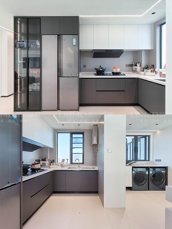 北面陽(yáng)臺(tái)直接納入客廳區(qū)域,與廚房磚墻處理做轉(zhuǎn)角落地柜,增強(qiáng)收納空間。