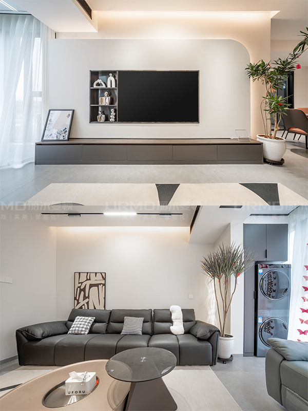 背景墻呼應吊頂做懸浮造型,弧形設計讓整體看起來更大氣