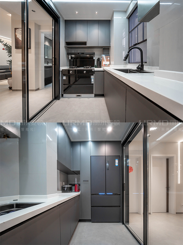統一配置超高房門,L型櫥柜均采用5大系統定制,高低臺面滿足人體工程學設計