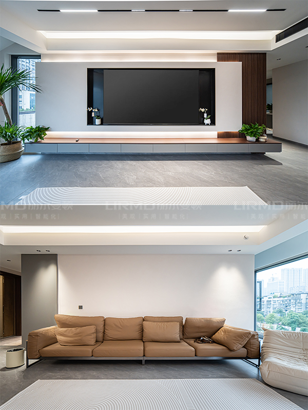 懸浮電視柜加上內嵌電視背景墻,連接走道收納柜,設計感十足