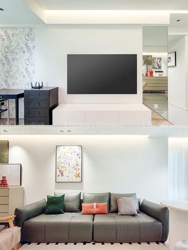 全屋通鋪 750×1500 瓷磚,整體通透大氣,L 型極簡懸空電視柜又簡潔大方還十分便捷,