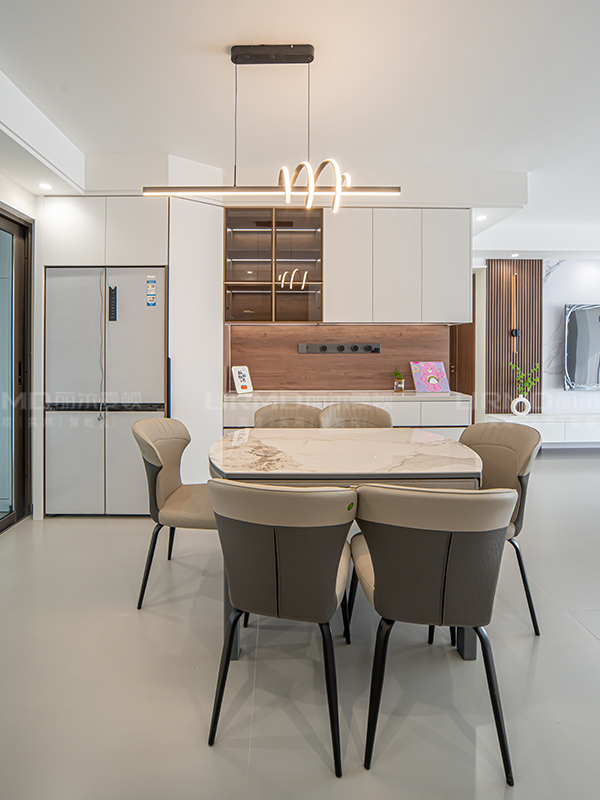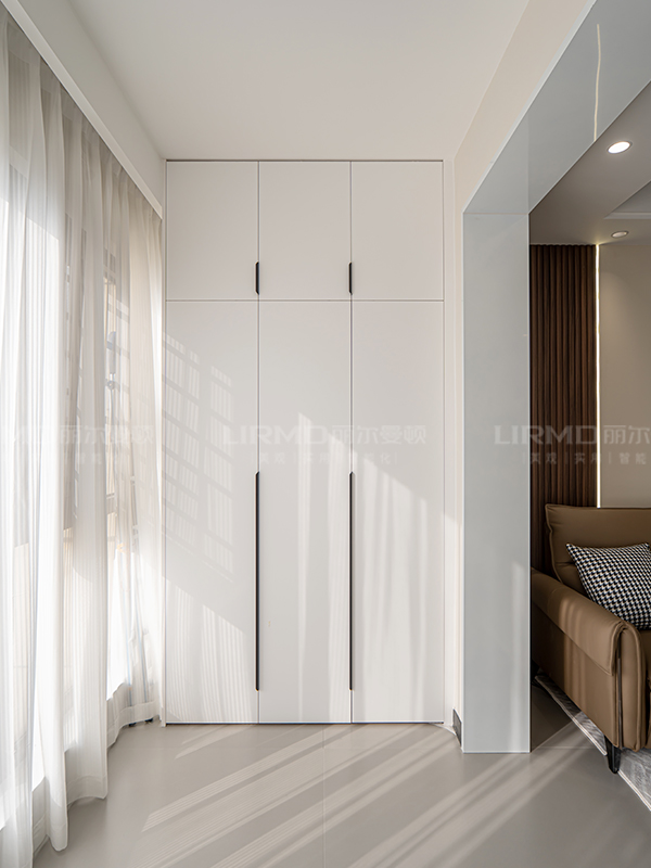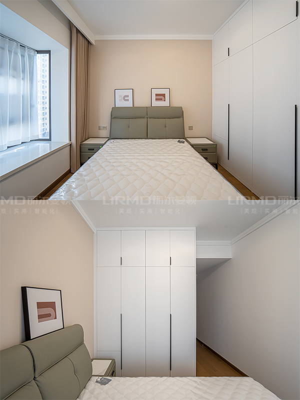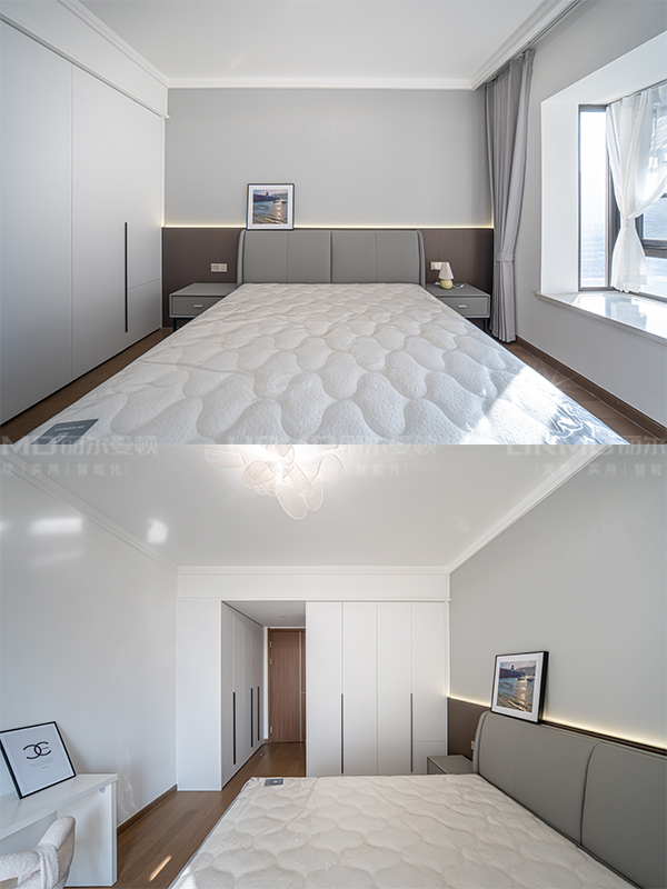 淺色與深色碰撞搭配,全房采用淺色系柜門,深色系家具搭配,增強(qiáng)空間的立體感