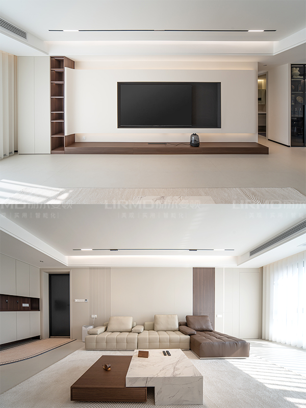 弧形設計,使電視背景墻左右側平緩過渡,內部安裝氛圍燈,烘托出家的暖意