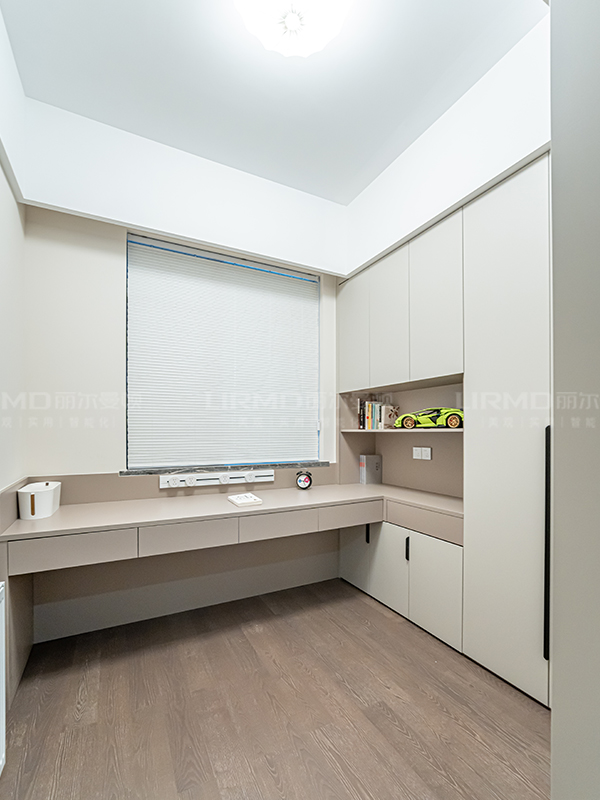 書(shū)柜轉(zhuǎn)角書(shū)桌一體式設(shè)計(jì),視覺(jué)上形成 L 型布局,增加空間連貫性。