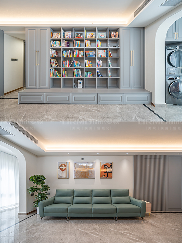 客廳正面書柜+地臺設計滿足收納展示需求,收納游走在半藏半露間營造出了一種圖書館的沉浸式閱讀空間