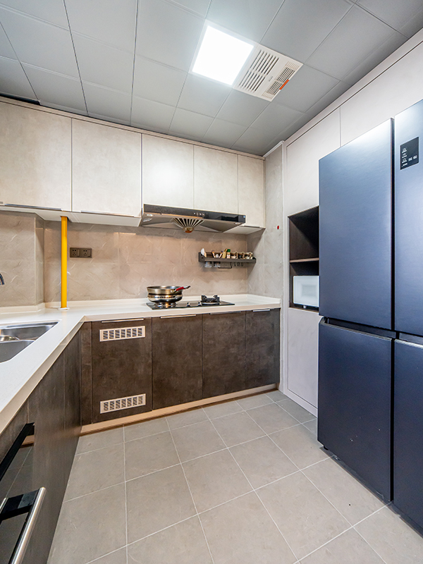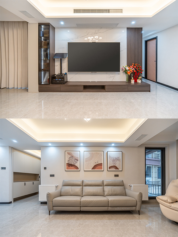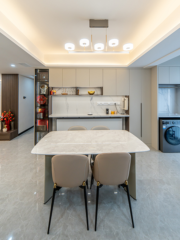 黑白灰的主色調(diào)搭配深色木制和燈光的點(diǎn)綴,讓整個(gè)家充滿了現(xiàn)代感與溫馨氣息