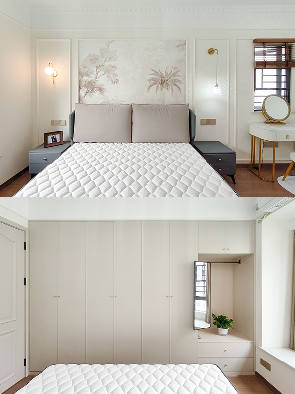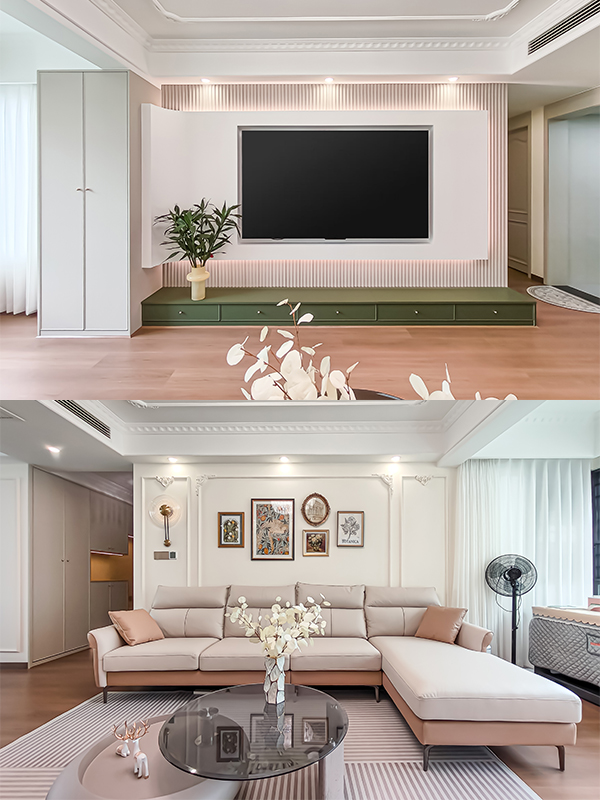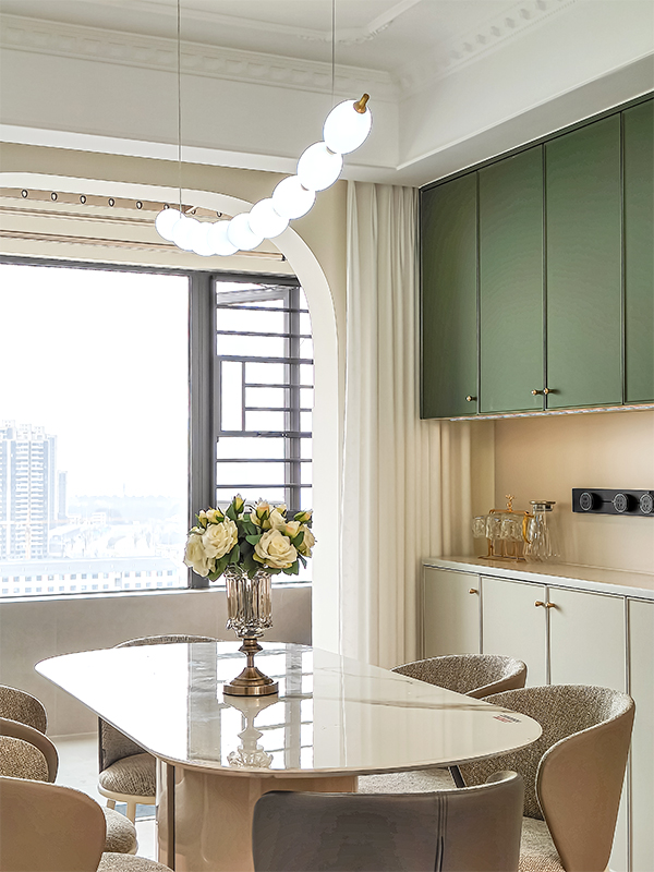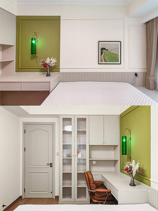 淡奶油色的墻面+地面木地板橄欖綠,跳脫出傳統(tǒng)現(xiàn)代法式的淺色單一元素,給法式的優(yōu)雅增添一份清新的美感