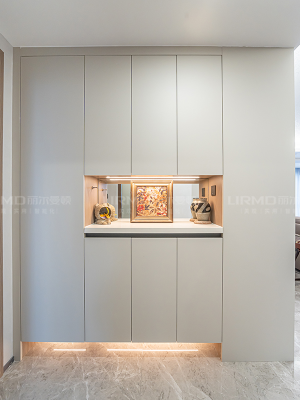 玄關加收納的轉角一體柜,銜接了玄關和客廳,讓整體空間更顯統一