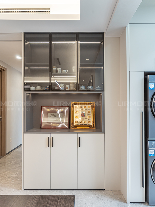 中間做玻璃隔斷增加衣帽間的透光性,玻璃柜門與吊柜結合讓空間利用最大化