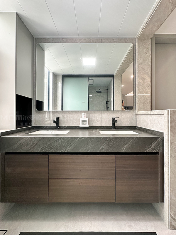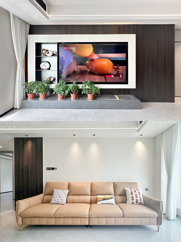 電視背景采用懸浮設(shè)計(jì),利用格柵護(hù)墻與巖板的搭配,清晰明了的線條,簡(jiǎn)單大氣