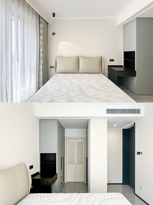 利用格柵隱形門與同色系的木飾面定制,增大電視墻的視覺效果,提高美感擴(kuò)大空間