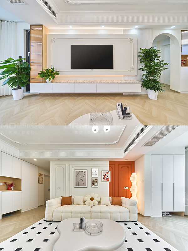 懸空電視柜、法式pu線條,為客廳營造出輕盈流動的視覺效果