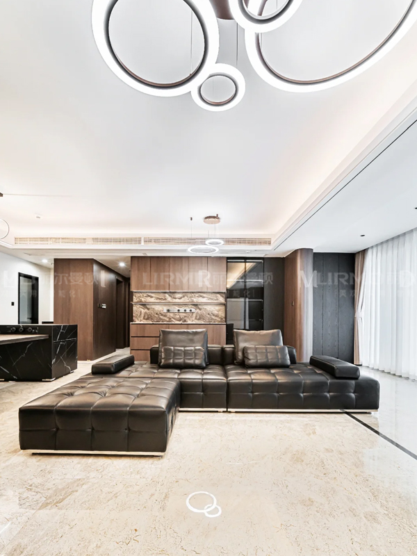 全房門墻柜一體化,圓弧設計,通體拉手等設計無不體現出麗爾曼頓10.0高定奢配工藝的實力。